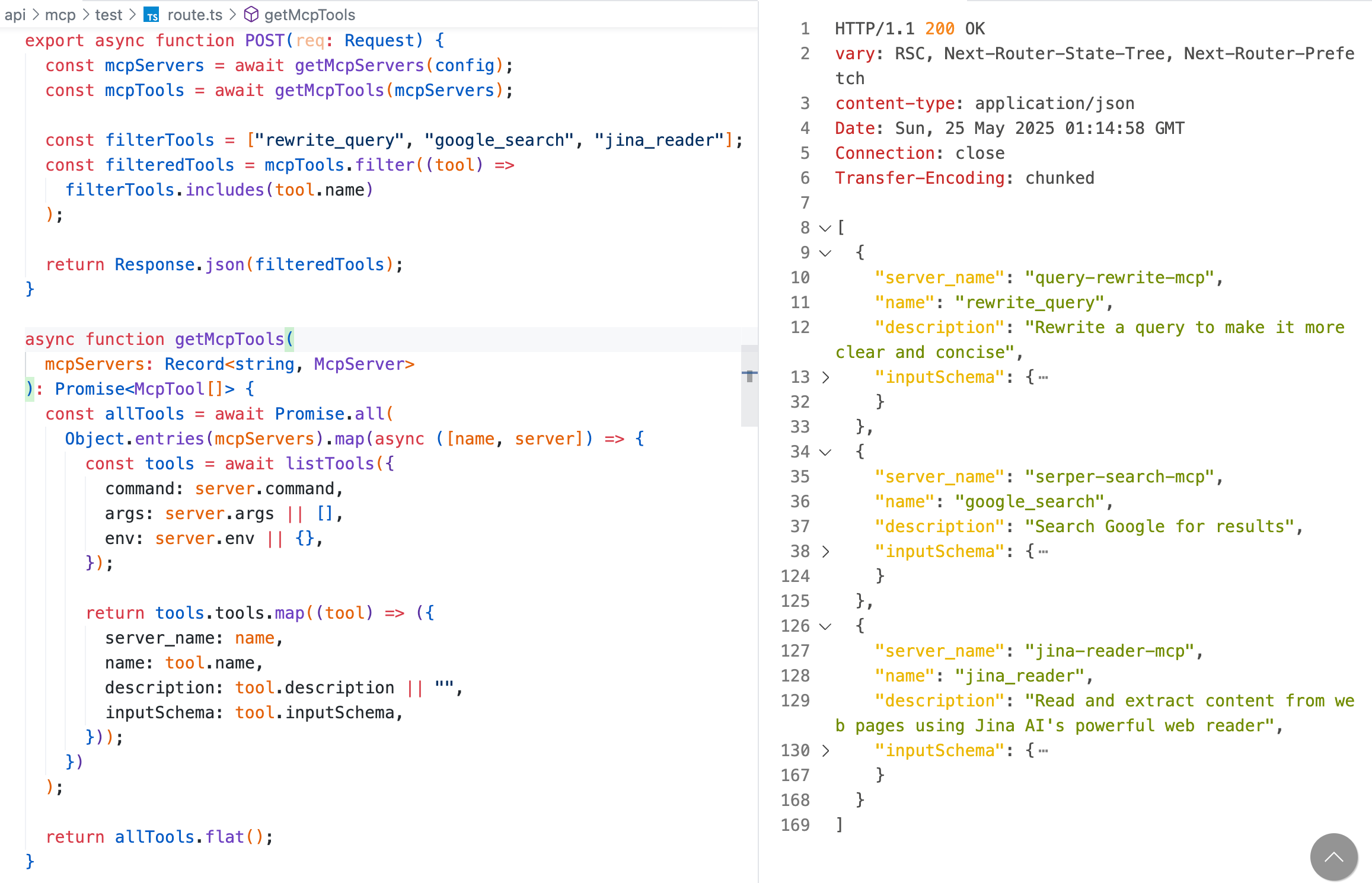 const mcpServers = await getMcpServers(config);const mcpTools = await getMcpTools(mcpServers);