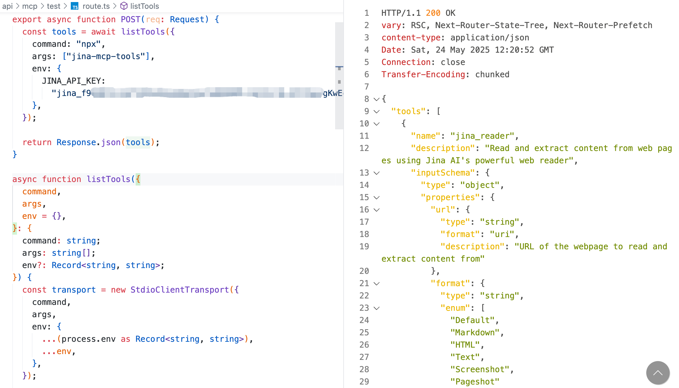 这里选择一个叫做 jina-mcp 的 MCP 服务器,其提供一个 jina_reader 工具,可以读取网页内容。配置此 MCP 服务器的运行信息,通过 listTools 函数获取此 MCP 服务器内部定义的工具列表,调试输出结果,如图 4-17 所示:
