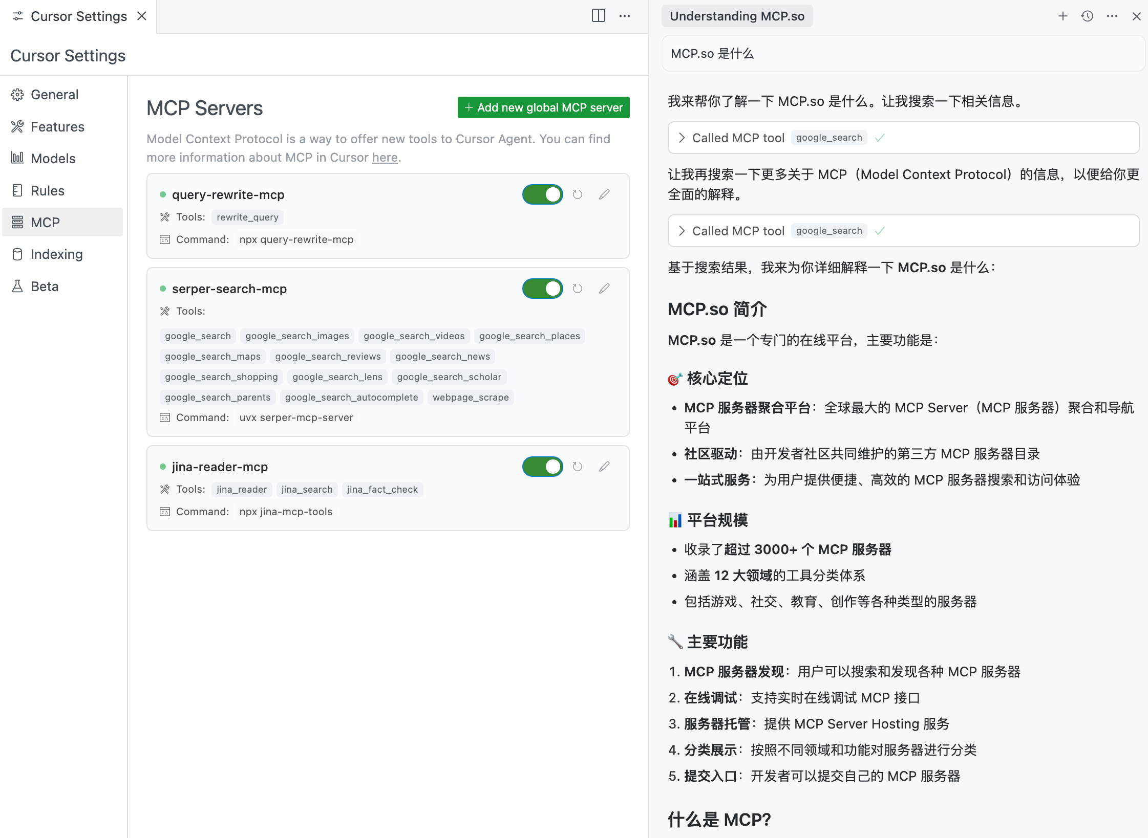 可以看到,Cursor 作为 MCP 客户端,按照提示词约定的工作流与大模型交互,先进行了一次问题改写,再进行了三次联网检索,最后读取了两个网页内容,最终回复查询问题,给出了准确的回答。