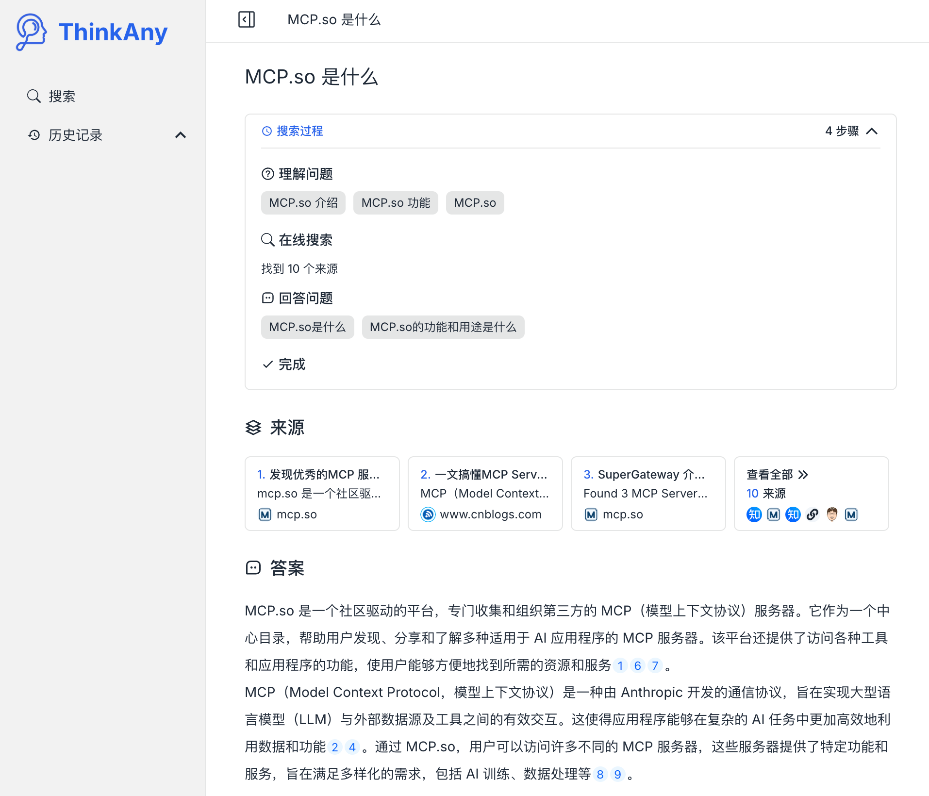 本节内容,我们计划开发一个与 ThinkAny 同名的 AI 搜索智能体,通过这个案例来演示智能体类 MCP 客户端开发的具体流程。