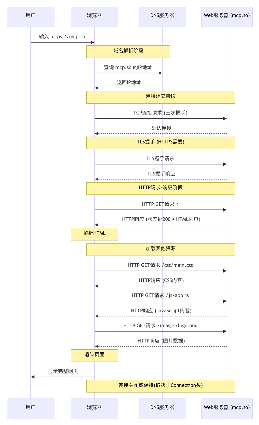 以用户在浏览器访问 https://mcp.so 这个网站举例,演示 HTTP 协议的工作原理,如图所示: