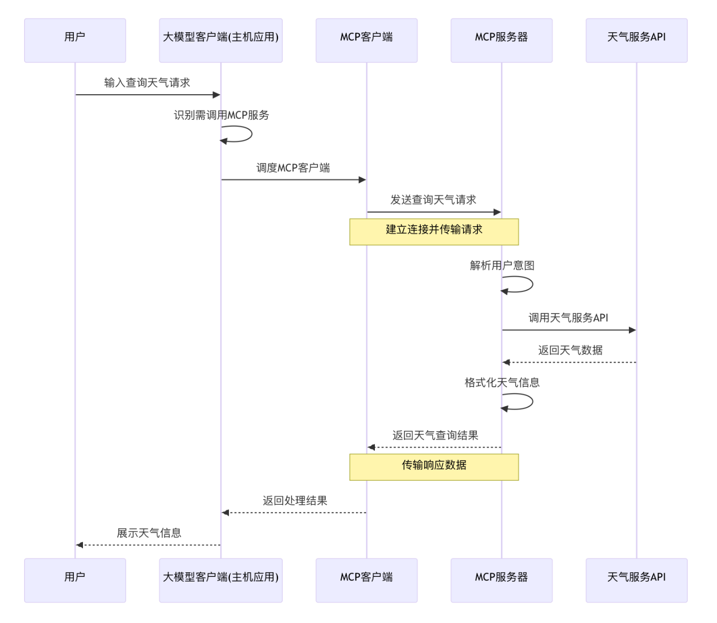 在这个例子中,大模型客户端是主机应用,接到用户查天气的请求后,通过 MCP 客户端发起请求到 MCP 服务器,由 MCP 服务器完成查天气的功能,再返回天气信息给 MCP 客户端,最终由大模型客户端展示天气信息给用户。