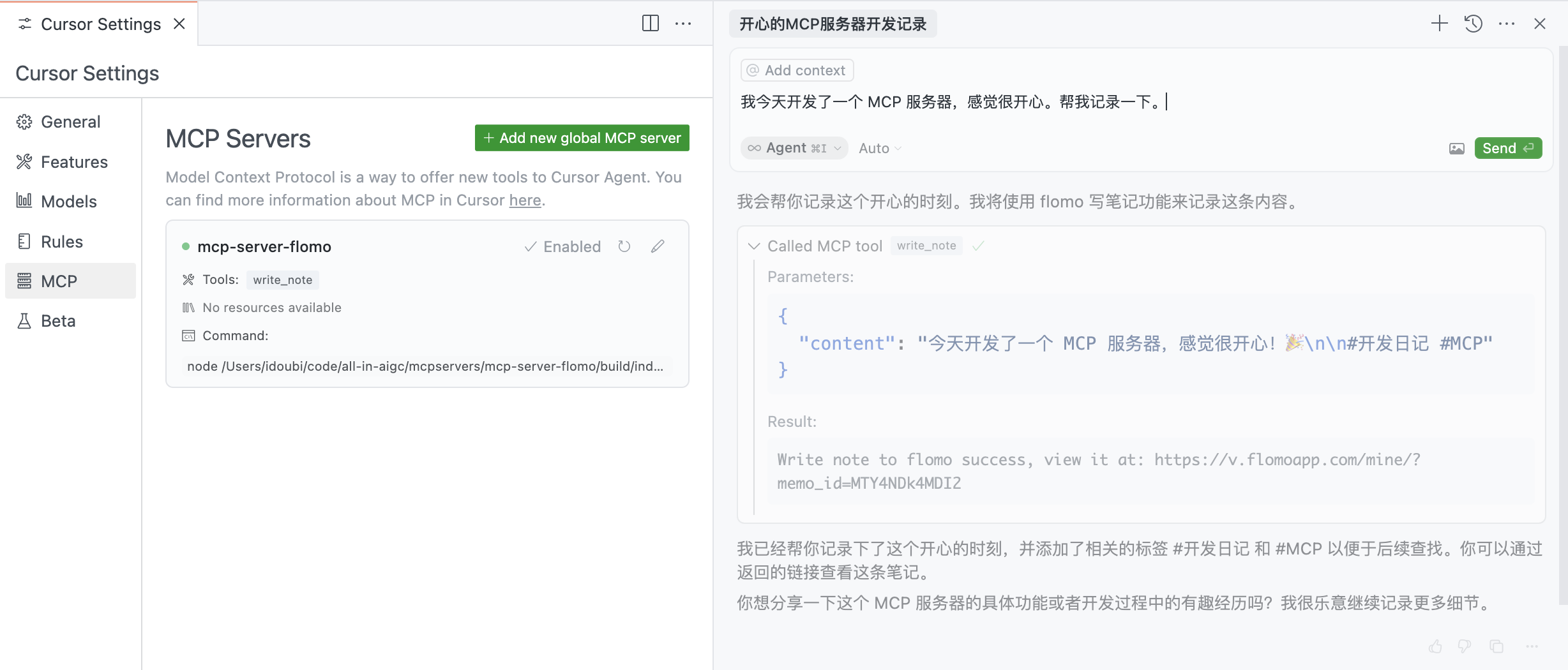 我们选择 Cursor AI 编辑器,作为 MCP 客户端。来测试我们开发的 mcp-server-flomo 服务器。