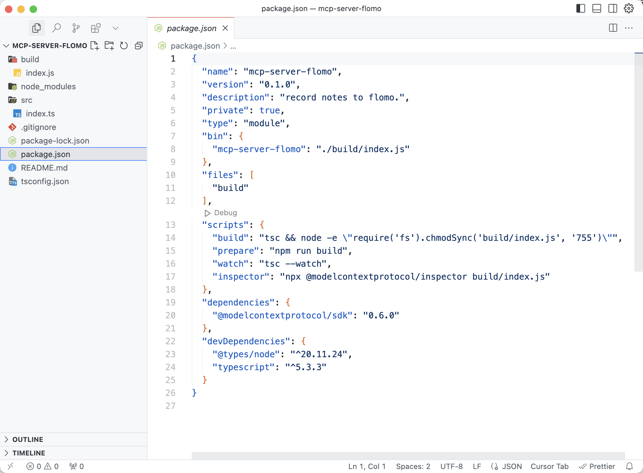 { "name": "@chatmcp/mcp-server-flomo", "version": "0.0.1", "description": "write notes to flomo.", "private": false, "type": "module", "homepage": "https://github.com/chatmcp/mcp-server-flomo", "bin": { "mcp-server-flomo": "./build/index.js" }, "files": ["build"], "scripts": { "build": "tsc && node -e \"require('fs').chmodSync('build/index.js', '755')\"", "prepare": "npm run build", "watch": "tsc --watch", "inspector": "npx @modelcontextprotocol/inspector build/index.js" }, "dependencies": { "@modelcontextprotocol/sdk": "0.6.0" }, "devDependencies": { "@types/node": "^20.11.24", "typescript": "^5.3.3" }}然后,执行命令,发布 npm 包: