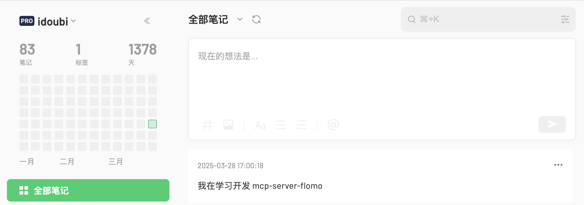 本节内容,我们开发了一个 MCP 服务器:mcp-server-flomo,对接 Flomo API,实现了在 MCP 客户端高效记笔记的功能。