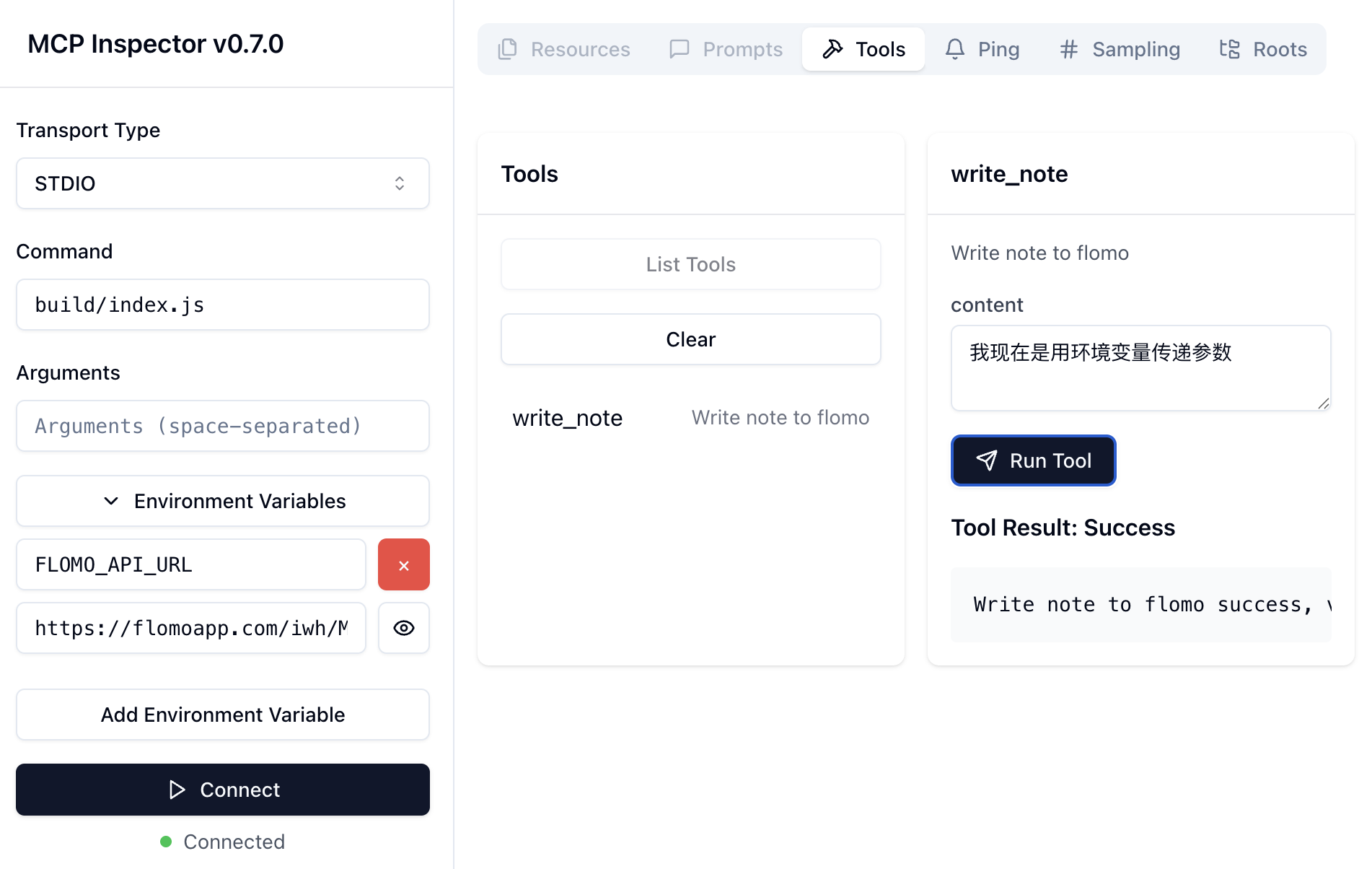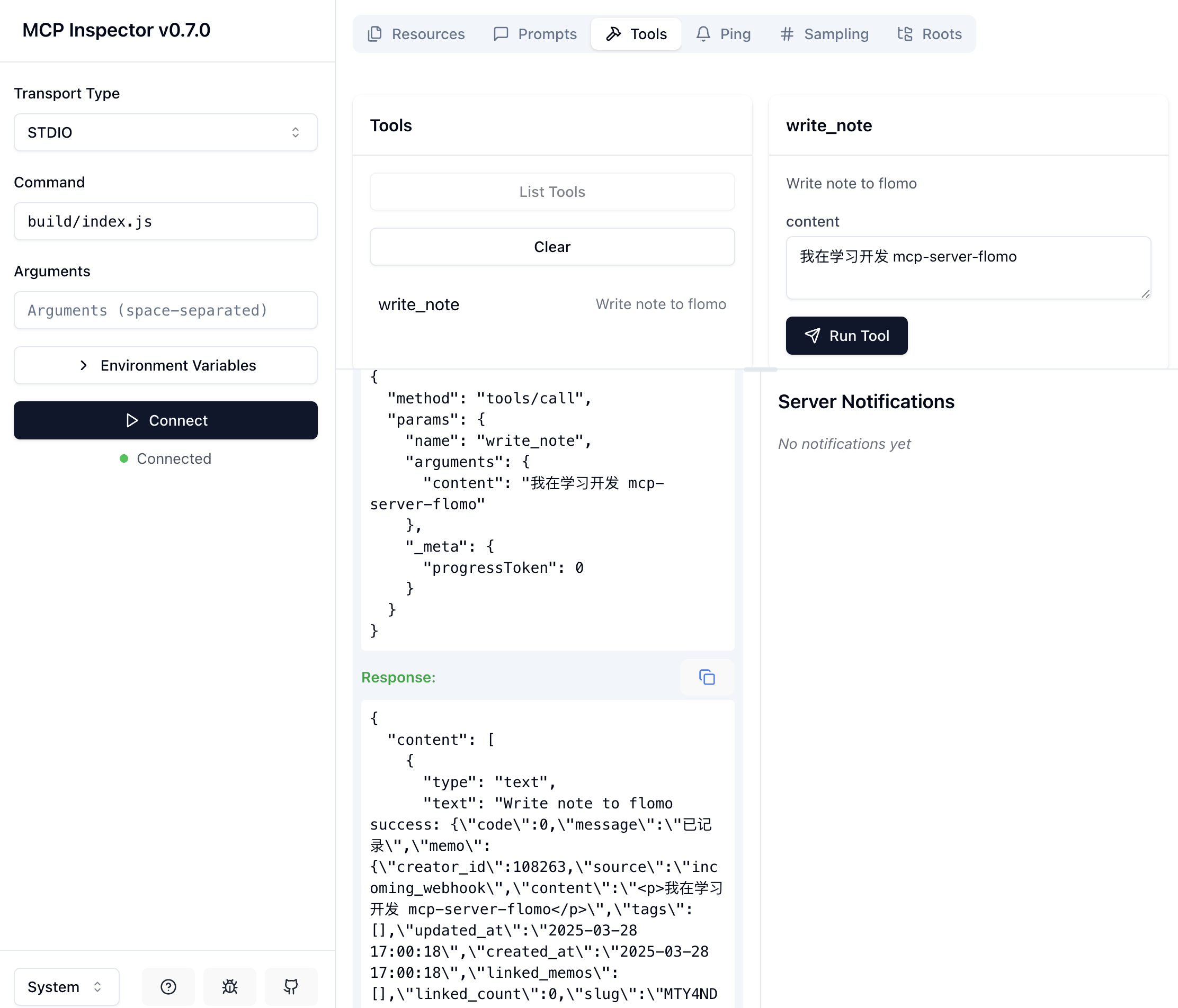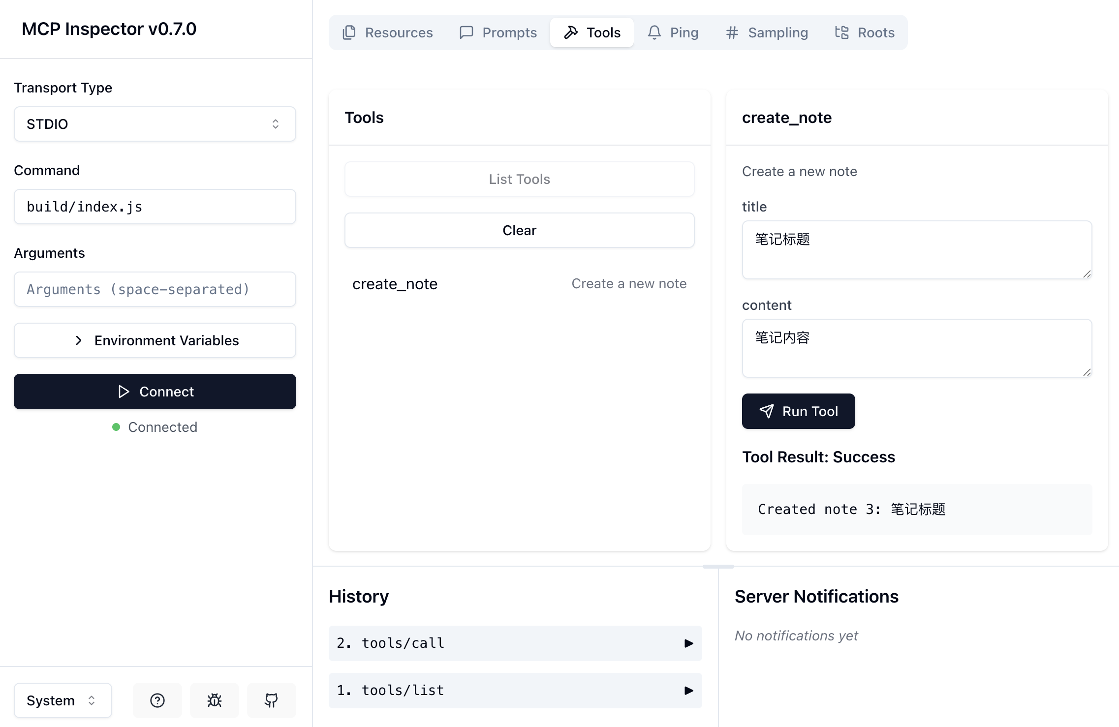 选择 Tools 下的某个工具(比如:create_note),在调试面板填写请求参数,,点 Run Tool,发送请求调用此工具,得到响应数据。
