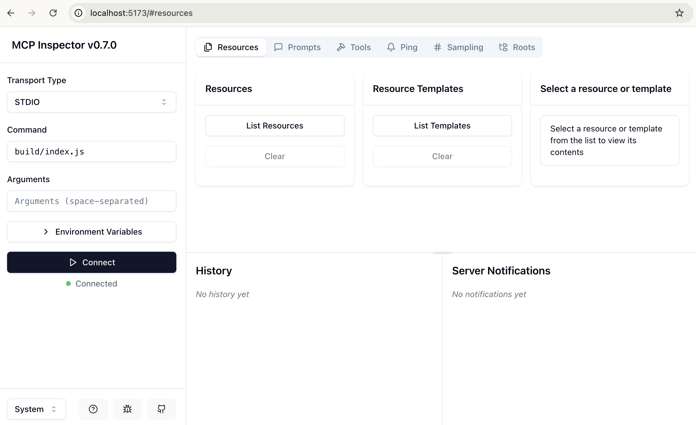 npx @modelcontextprotocol/inspector build/index.js此命令用到了 MCP 官方开发的一个调试工具,运行 MCP 服务器可执行文件,连接到 MCP 服务器进行功能调试。