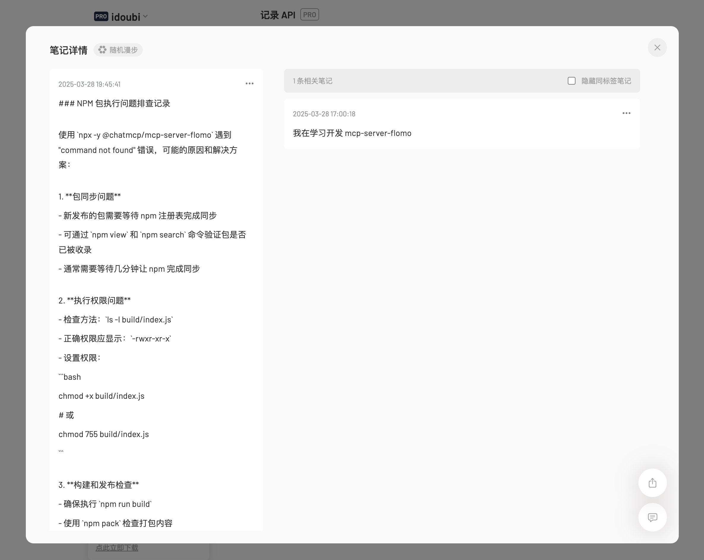 { "mcpServers": { "mcp-server-flomo": { "command": "npx", "args": ["-y", "@chatmcp/mcp-server-flomo"], "env": { "FLOMO_API_URL": "https://flomoapp.com/iwh/xxx/xxx/" } } }}在 MCP 客户端(比如 Cursor)继续测试,例如可以在利用 AI 解决某个问题之后,一键保存问题信息和解决办法到 Flomo: