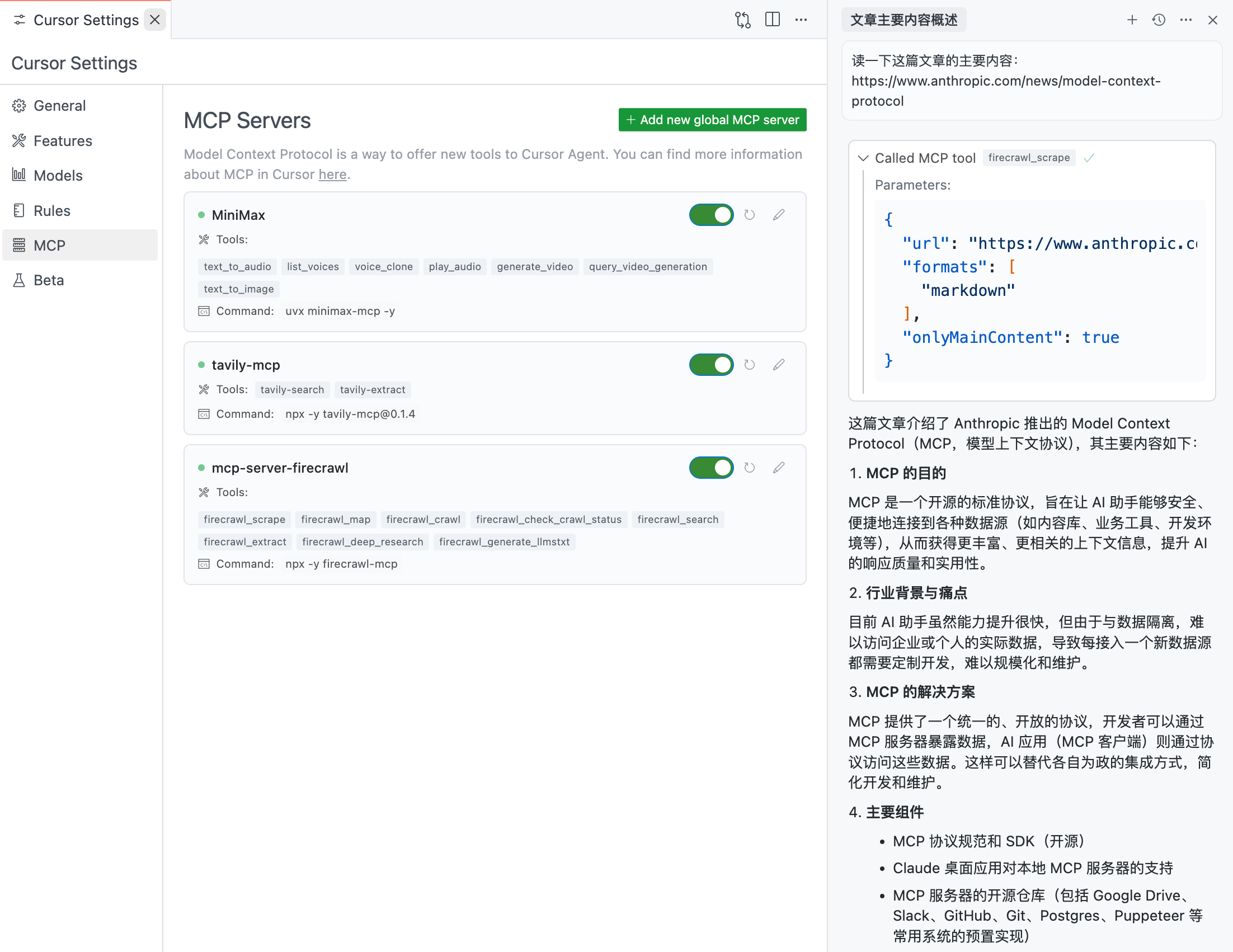 Cursor 接到请求后,调用 Firecrawl MCP 服务器的 firecrawl_scrape 工具获取了 URL 对应的内容。