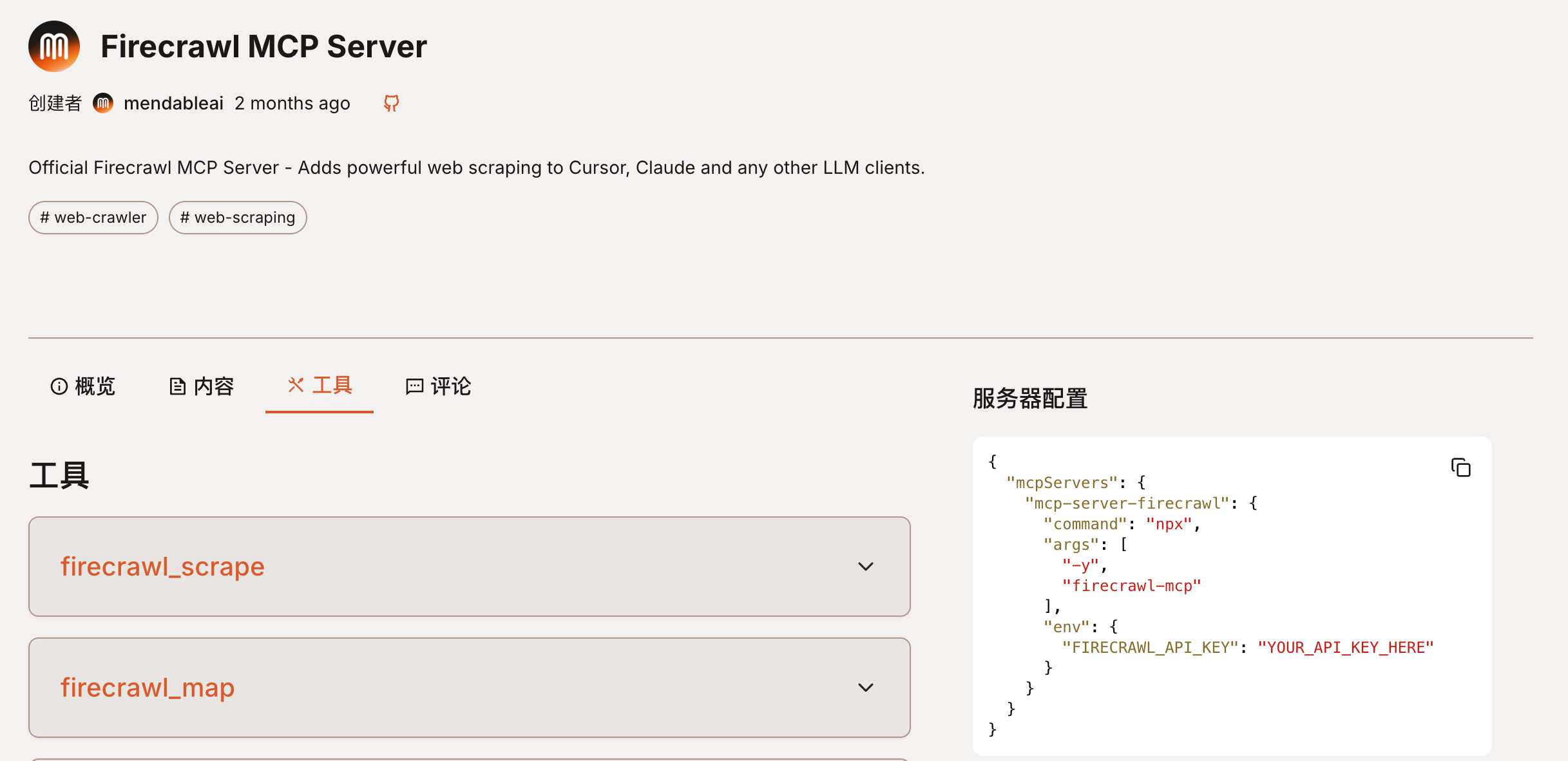 我们选择 Firecrawl MCP Server,来实现抓紧网页内容的需求。