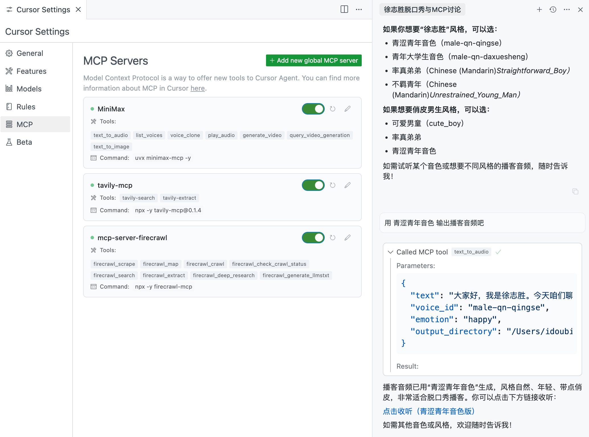 可以看到,Cursor 在请求大模型生成播客脚本之后,调用 MiniMax MCP 服务器的 text_to_audio 工具,把播客脚本转成音频,并把音频的链接回复给了用户。