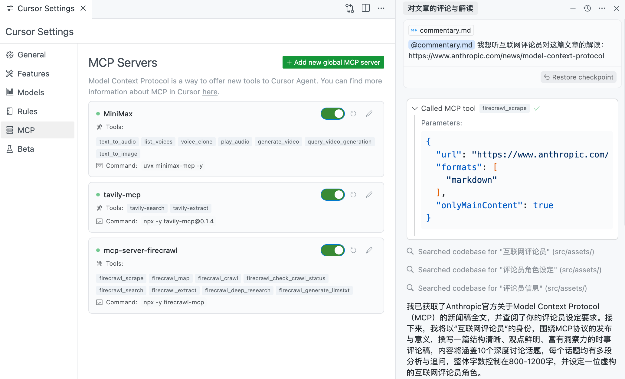 评论员信息请根据用户补充内容生成,如无则自行设定。我们把提示词保存在 commentary.md 文件中,然后在 Cursor AI 对话框中,引用这个提示词文件,输入 Anthropic 发布 MCP 协议的文章地址,要求生成对内容的解读,如图所示: